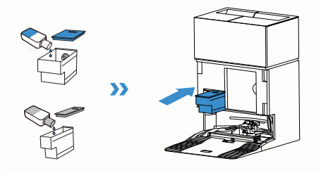 1.Remove the cleaning solution tanks' cover, take out the disinfectant cleaning solution tank, fill it with ECOVACS cleaning solution, then close the lid and place it back into the station.