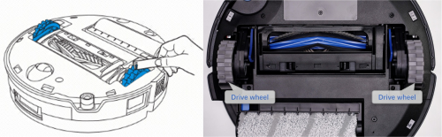 2.Turn off the robot, flip it over, and clean the drive wheels. First, dampen a cloth, wring it out, and wipe the wheels. Then, dry them with a clean cloth.