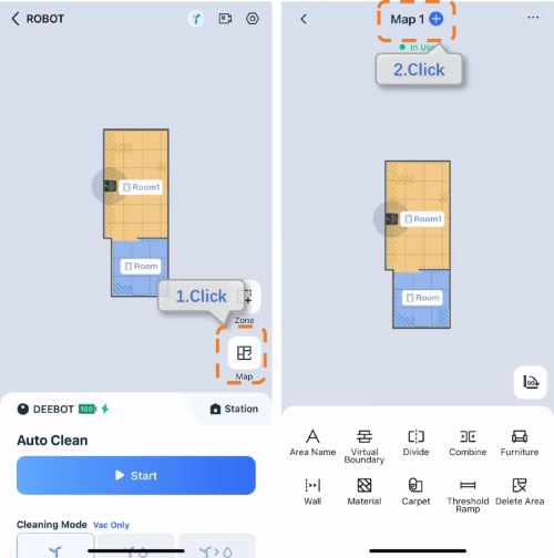 2. Move the DEEBOT to the new environment where you want to create a map. Then tap “Map” > “+” > “Add New” > tap “Start Mapping”.
