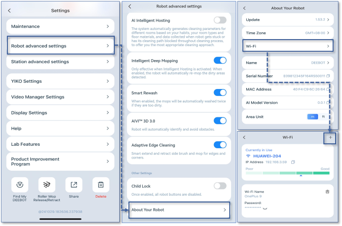 1. Click ‘Settings’ in the upper right corner of the page > click ‘Robot Advanced Settings’ > click ‘About Your Robot’ > click Wi-Fi Management > click ‘+’ to add multiple Wi-Fi signals.