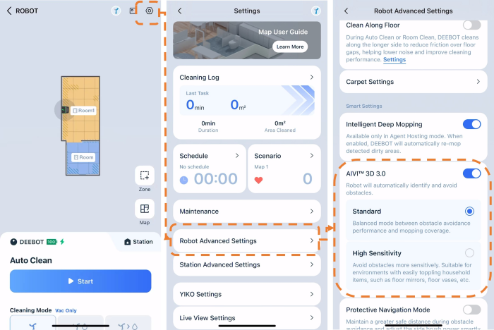 1.Open APP>Enter>Settings>DEEBOT Advanced Settings>enable AIVI 3.0, select Standard Mode;