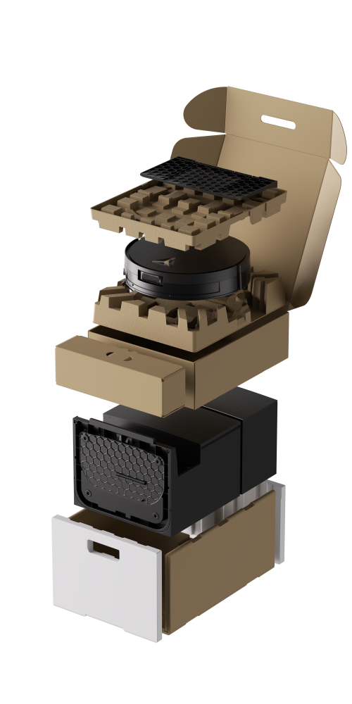 5.Place the station securely at the bottom of the box and cover it with the protective foam. Put the robot in the side compartment.