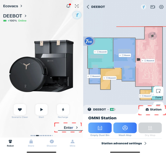 2.Click the Station icon, and select dust collection, drying, and mop cleaning according to your demand.
