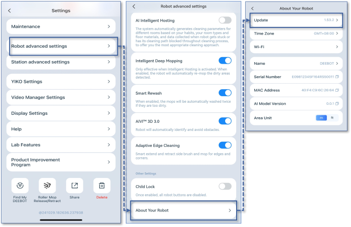 Click ‘Settings’ in the upper right corner of the page > click ‘DEEBOT Advanced Settings’ > click ‘Robot Information’ > click ‘Upgrade’ and follow the prompts to upgrade.