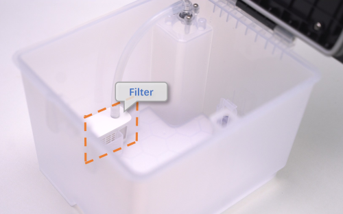 3. Open the water tank, remove the filter, disconnect the water hose and rinse the filter carefully with clean water. After rinsing, reinstall the filter, and secure the tank.