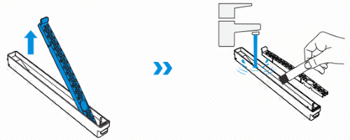 2.Slide up the blue latch to release the water tray. Take out the filter and clean both the tray and filter thoroughly (use tools if needed).