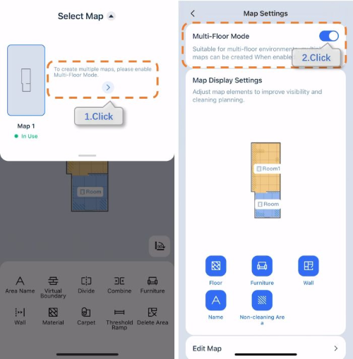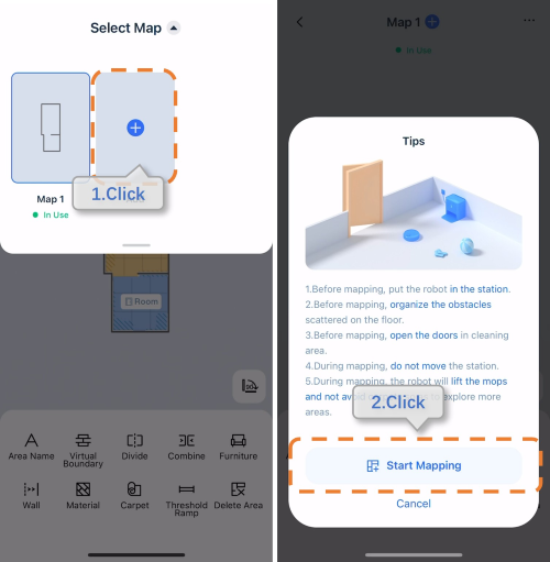 2. Move the DEEBOT to the new environment where you want to create a map. Then tap “Map” > “+” > “Add New” > tap “Quick Mapping”.