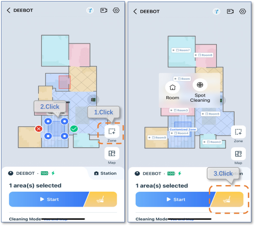 1.Open APP>Click Enter>Click Zone icon>Click yellow icon, mop only, to start cleaning.