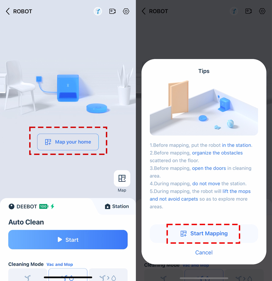 1.Open all doors, remove obstacles from the floor, and ensure sufficient lighting to allow the map to cover the entire home environment.