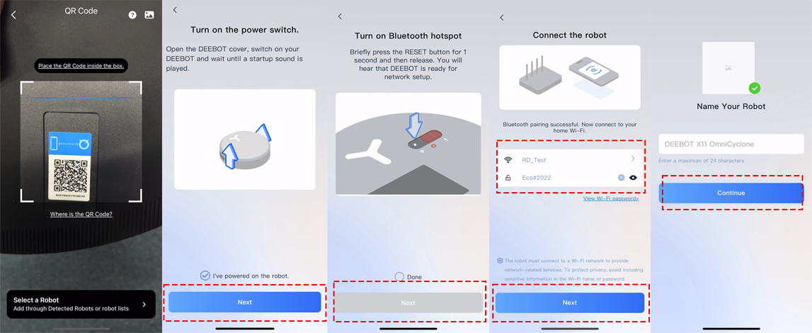 2.Follow the app prompts: Open the robot's top cover, switch the power to "I," and wait for the sound. Select "Next," press the network button briefly, confirm you hear "Bluetooth hotspot released," then select "Next" to start the hotspot connection. Wait for network access.